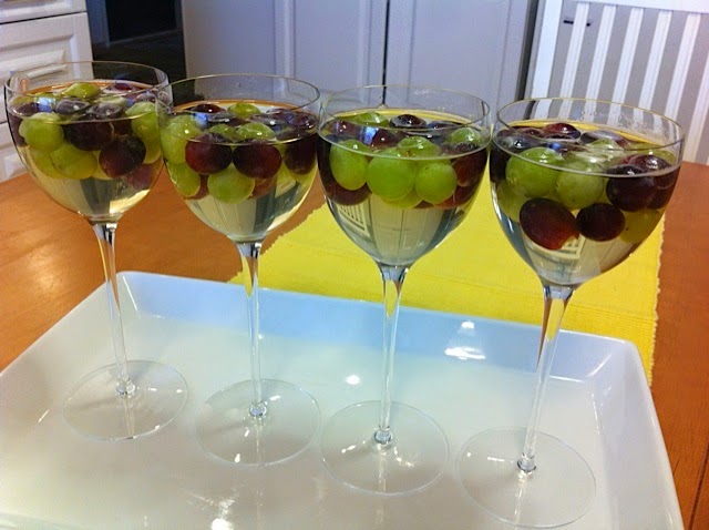 3. Laita jalallisiin laseihin pestyjä punaisia ja vihreitä rypäleitä kokonaisina, pienet rypäleet ovat kauneimpia. Kaada viiniseos päälle ja vie kylmään hyytymään muutamaksi tunniksi. Omassa kylmiössäni hyytelö oli täysin hyytynyt 2,5 tunnin kuluttua.